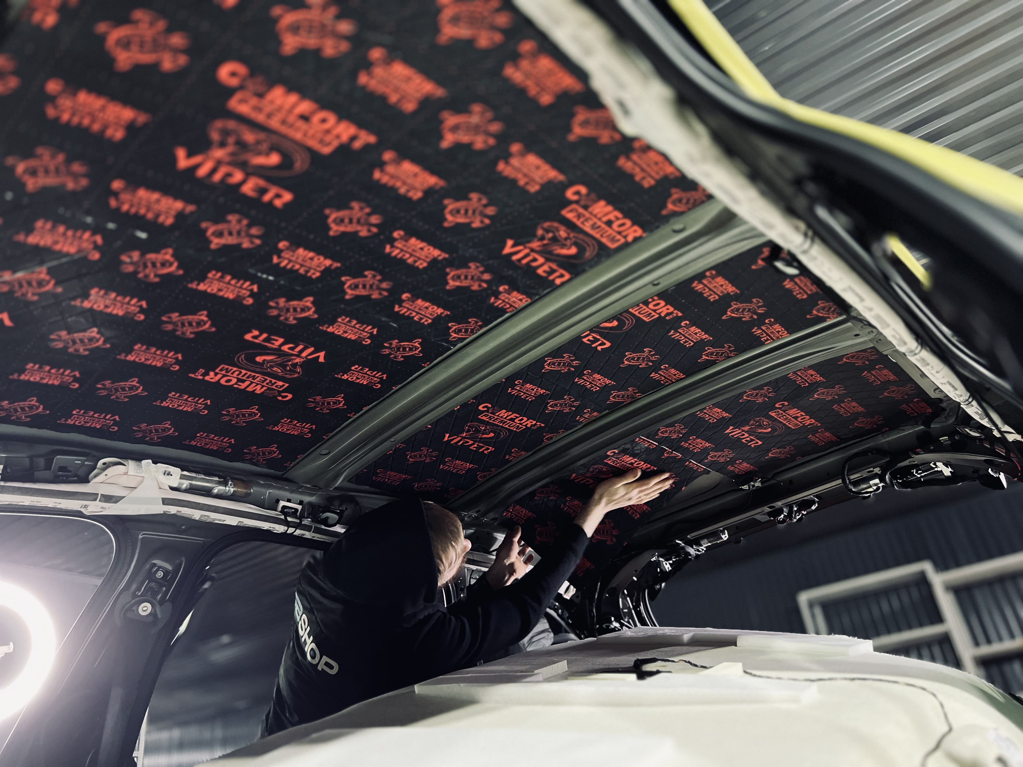 Процесс нанесения первого слоя требовал высокой точности. Первым слоем на крышу нанесли виброизоляцию Comfort Mat Viper, ультралегкий инновационный материал премиального уровня толщиной 3 мм.