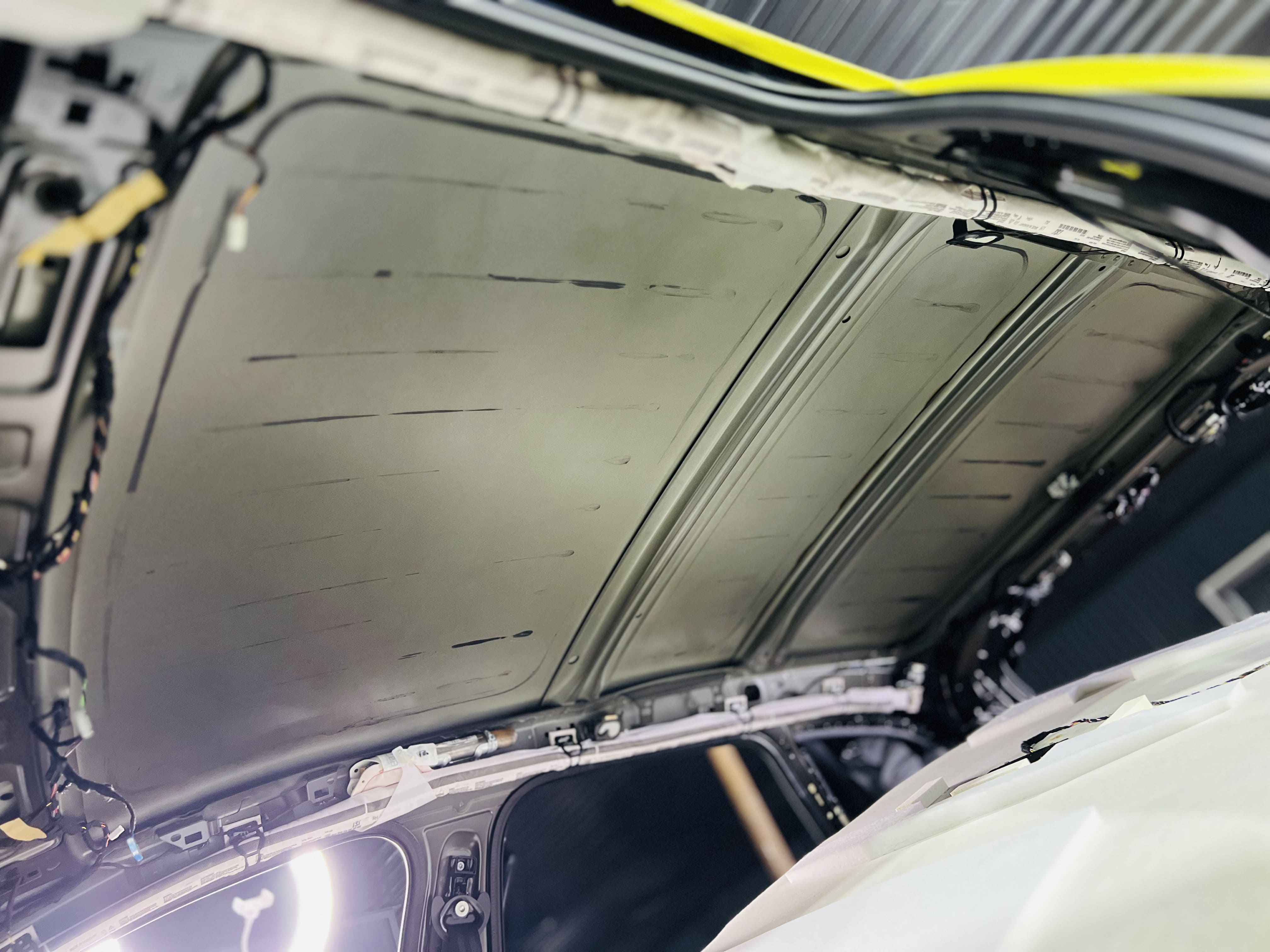 Процесс нанесения первого слоя требовал высокой точности. Первым слоем на крышу нанесли виброизоляцию Comfort Mat Viper, ультралегкий инновационный материал премиального уровня толщиной 3 мм.