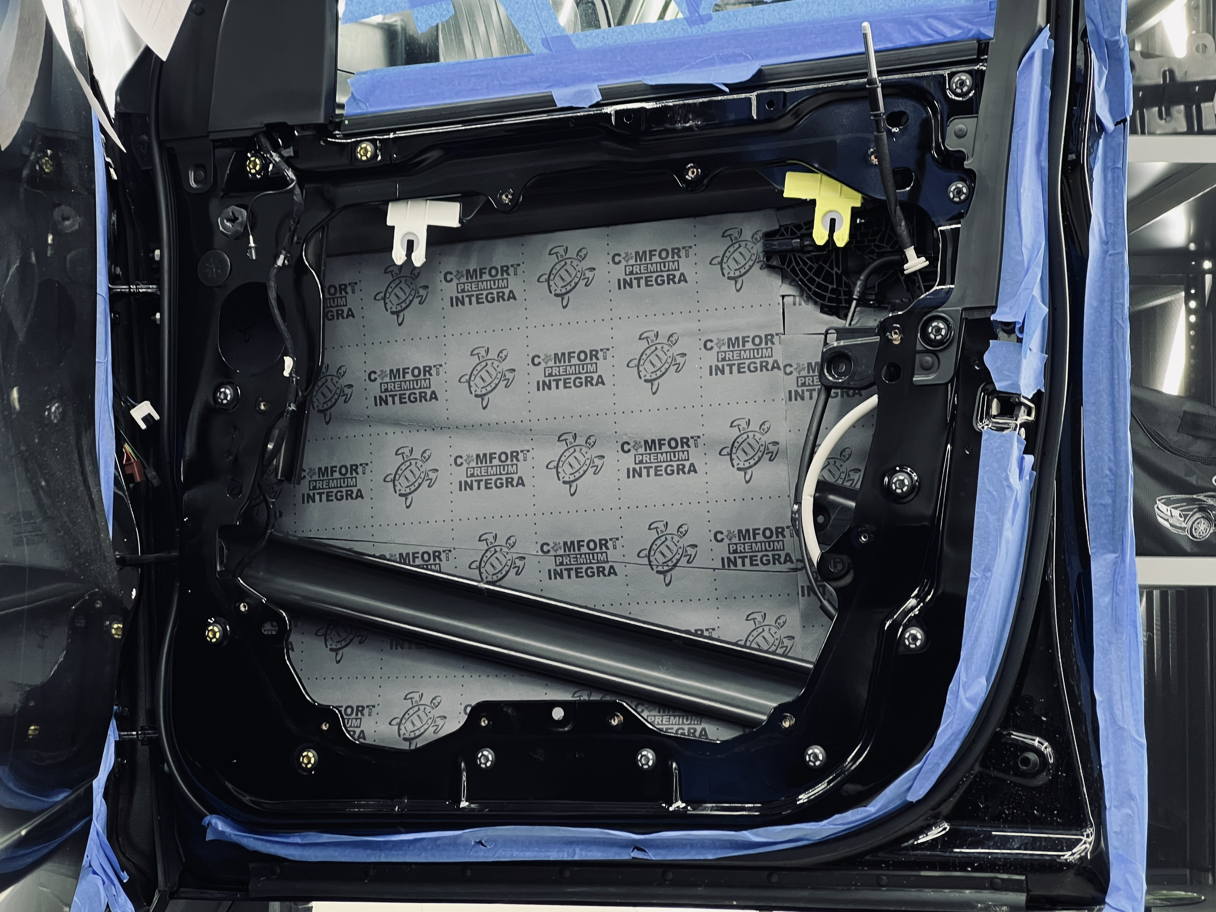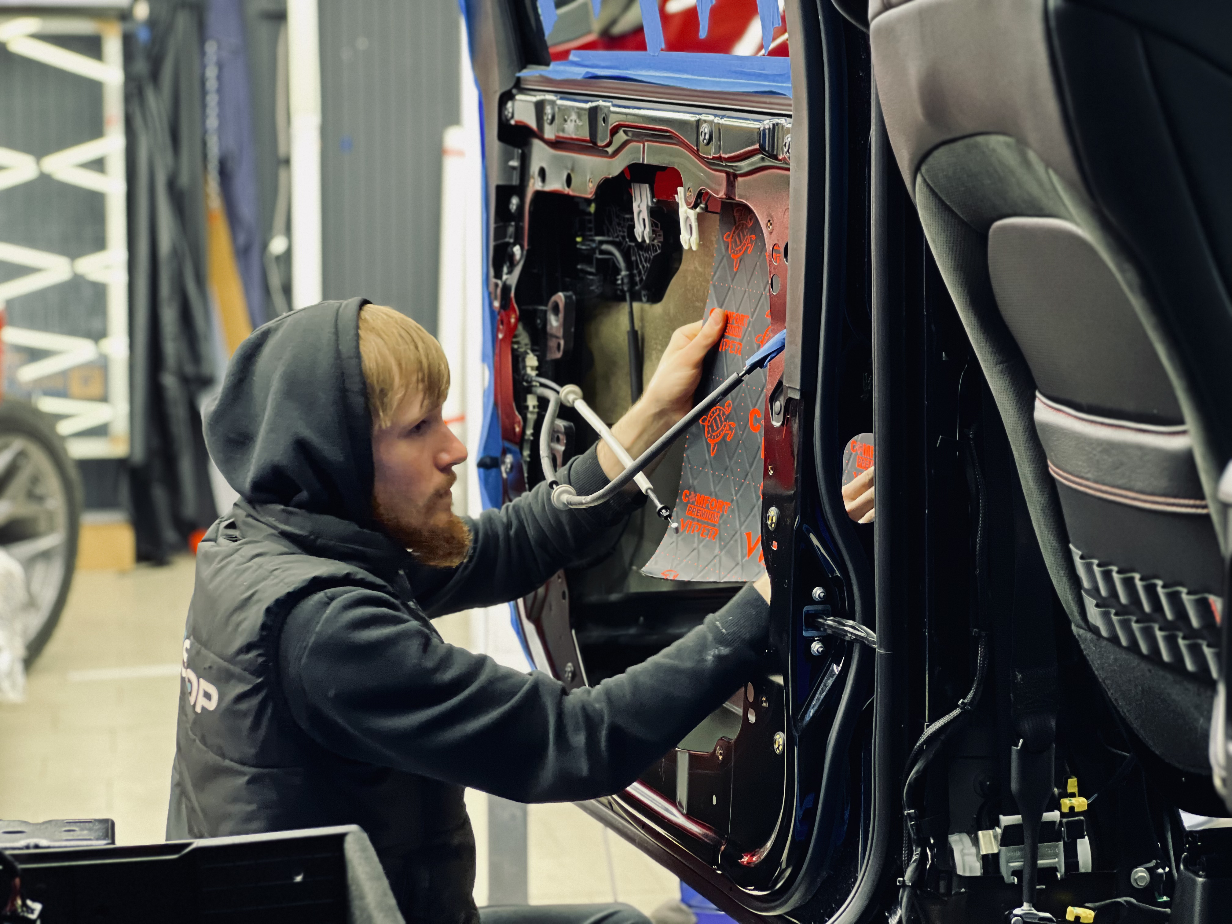 Первым слоем нанесли виброизоляцию Comfort Mat Viper, которая гасит вибрации и создает прочную основу. На снимке виден процесс наклейки Viper на внутреннюю стенку двери, с аккуратным нанесением.
