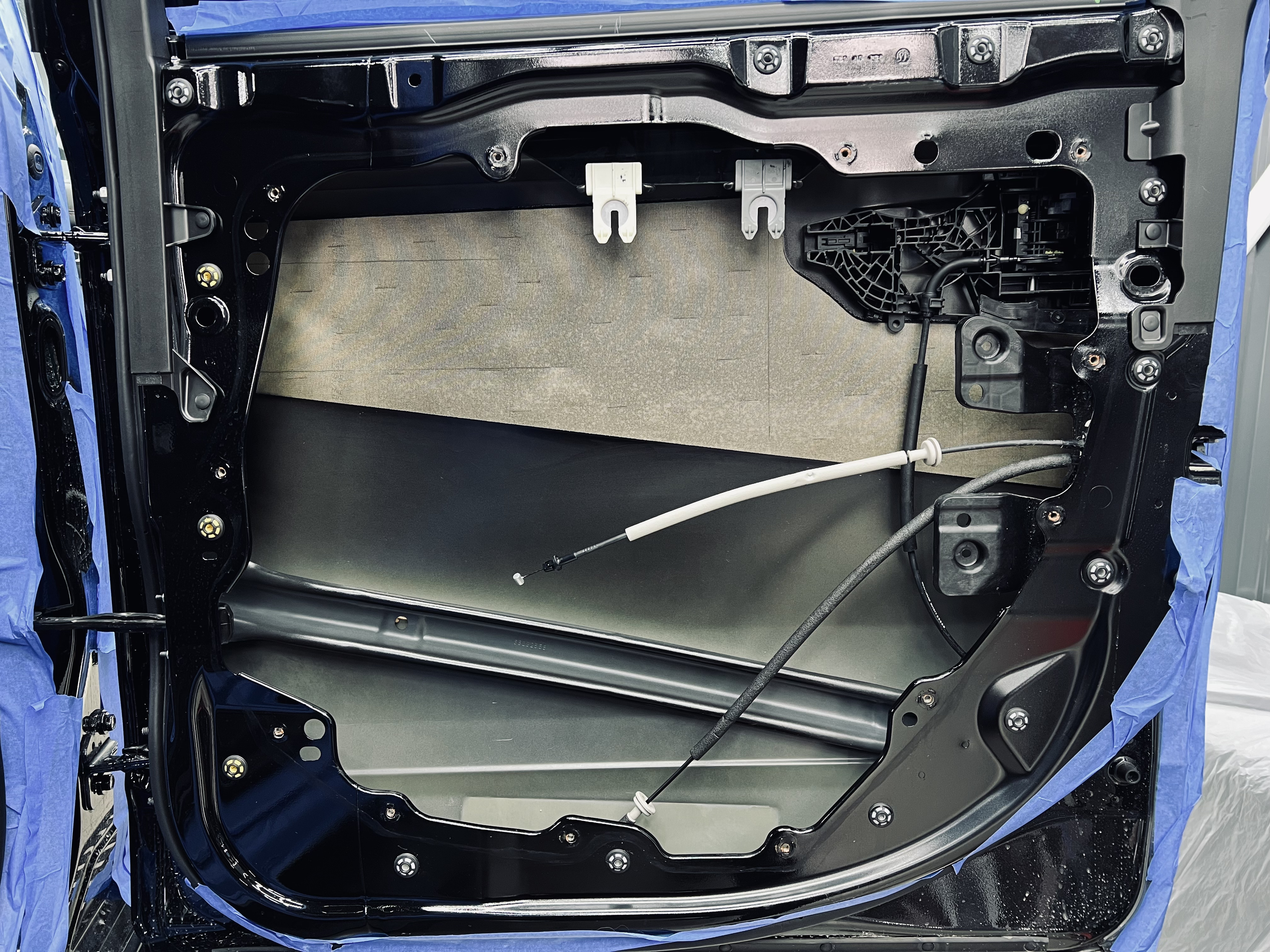 Работа началась с демонтажа дверных карт. На фото показана подготовленная дверь с чистым металлом, готовая к нанесению материалов.