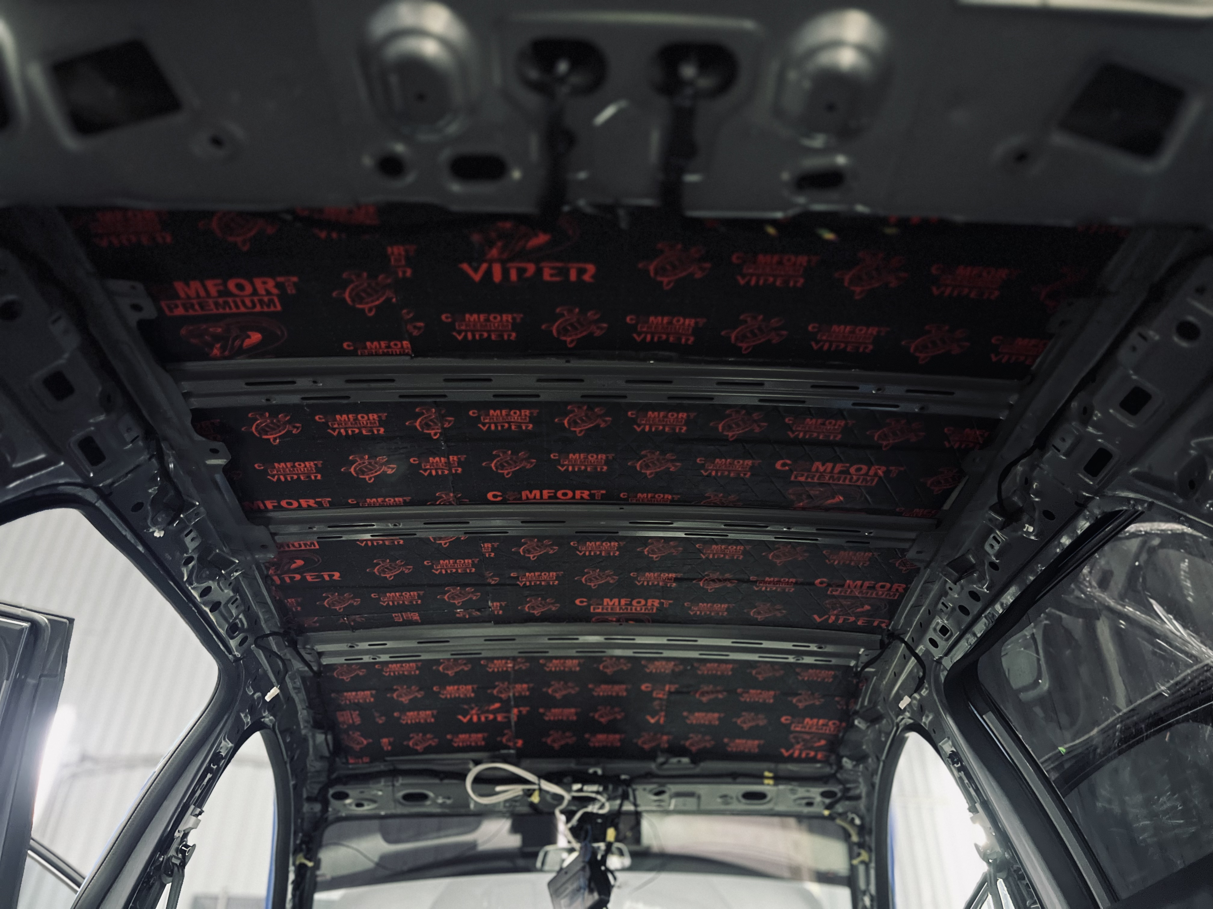Первым слоем нанесли Виброизоляцию Comfort Mat Viper, которая гасит вибрации металла.