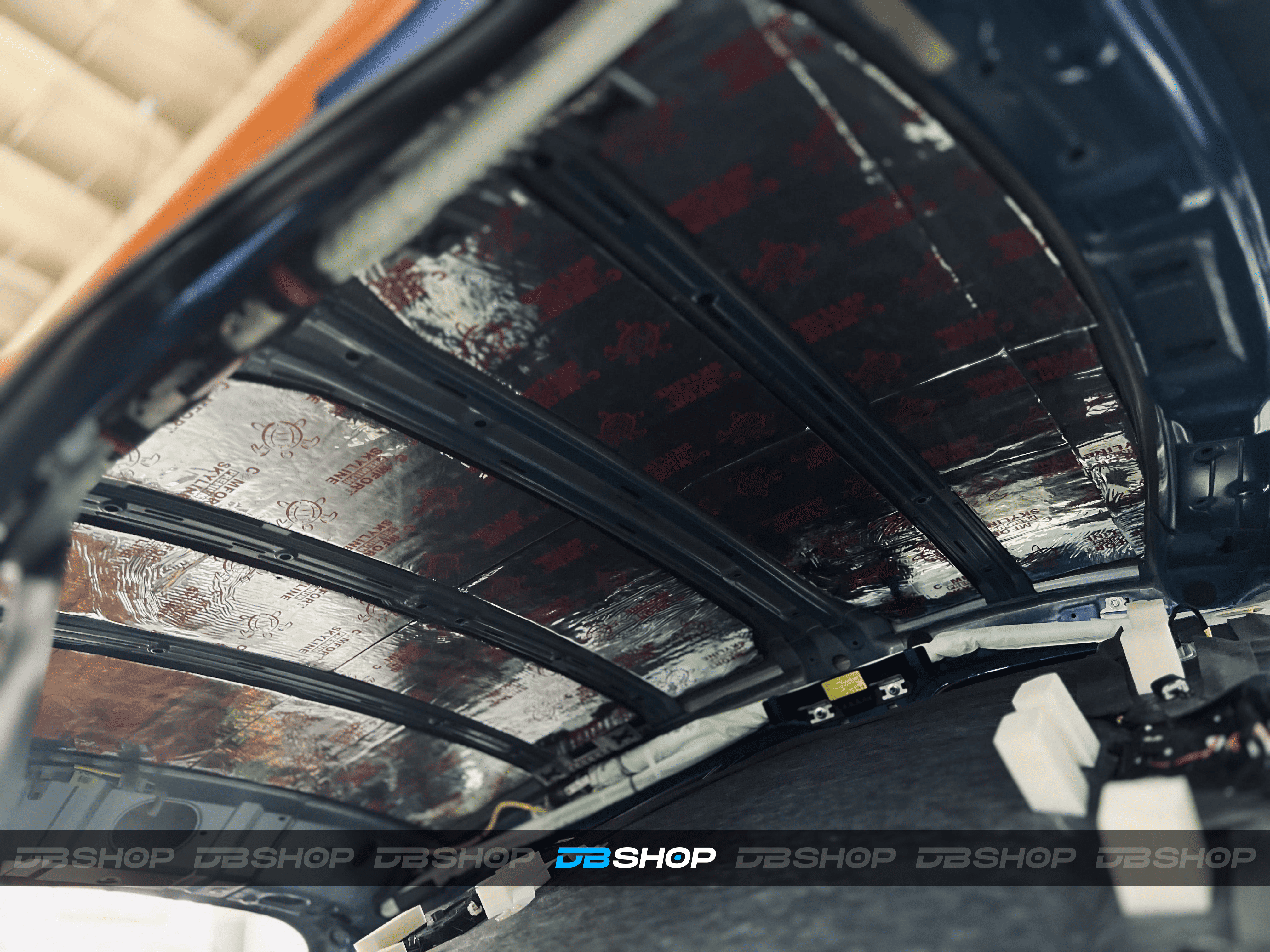 Первым слоем на крышу нанесли виброизоляцию Comfort Mat Cobra. Инновационный шумоизолирующий материал толщиной 2,3 мм. Относится к премиальной серии, обладает улучшенным КМП. Отличается небольшим весом.