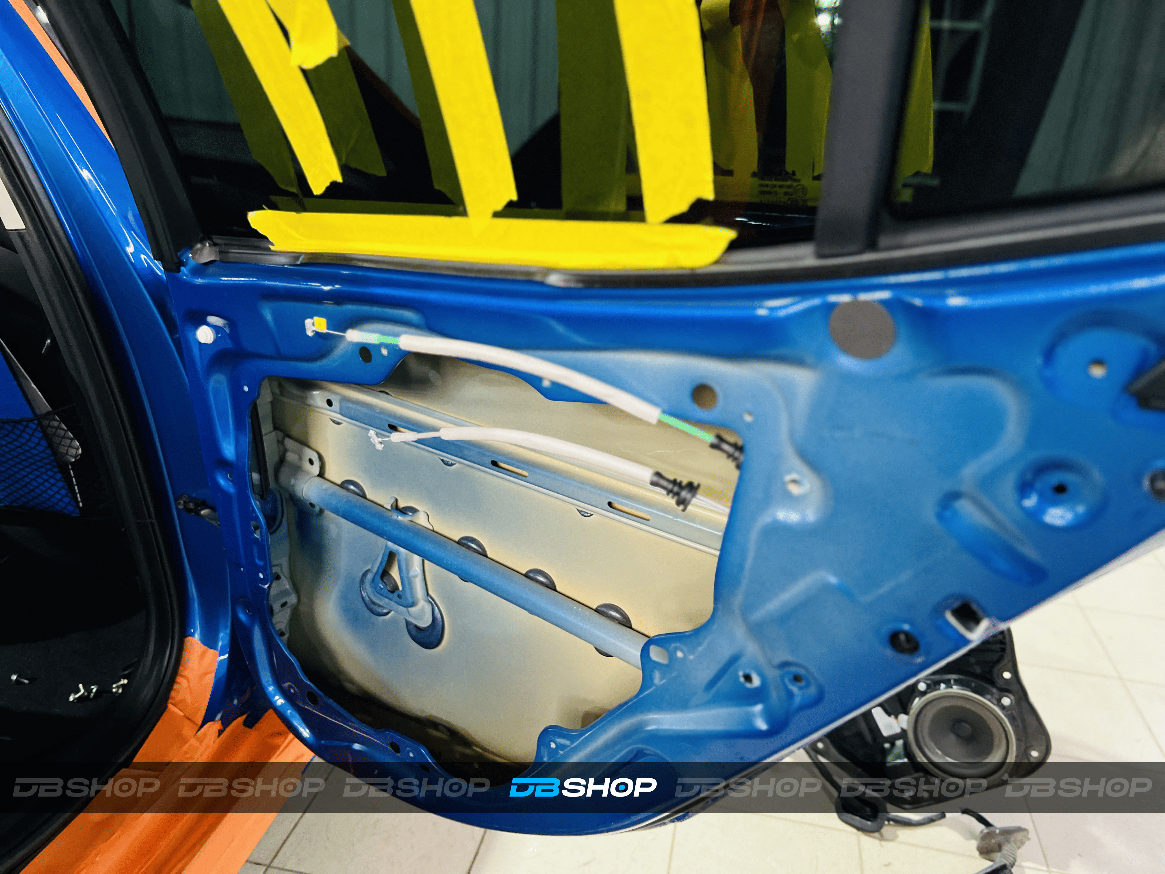 Работа началась с демонтажа дверных карт. На фото показана подготовленная дверь с чистым металлом, готовая к нанесению материалов.
