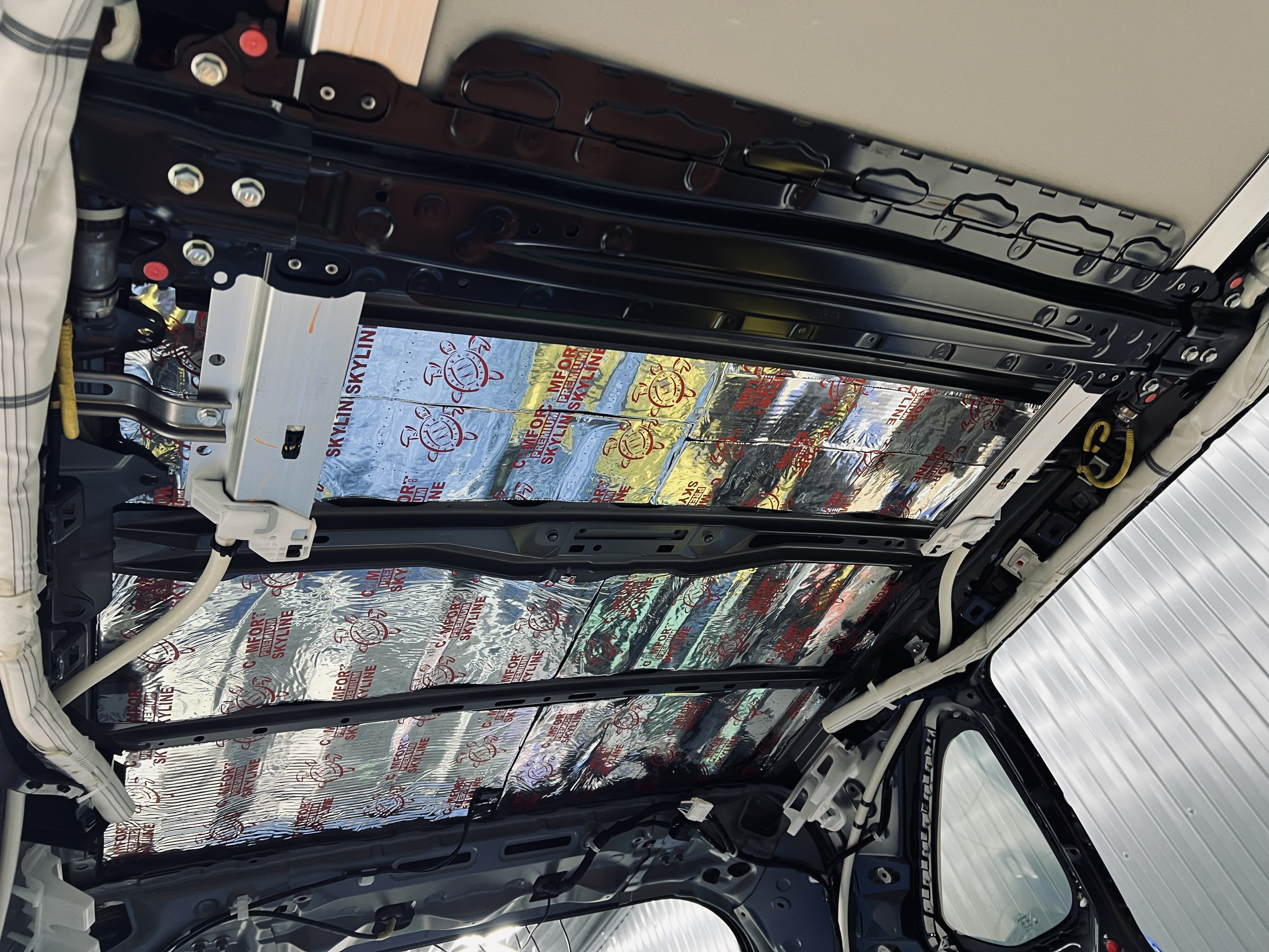 Вторым слоем уложили шумоизоляцию Comfort Mat Premium Skyline, легкий и эффективный материал, завершающий изоляцию. На фото показана крыша с готовым слоем Premium Skyline, обеспечивающим максимальную тишину.