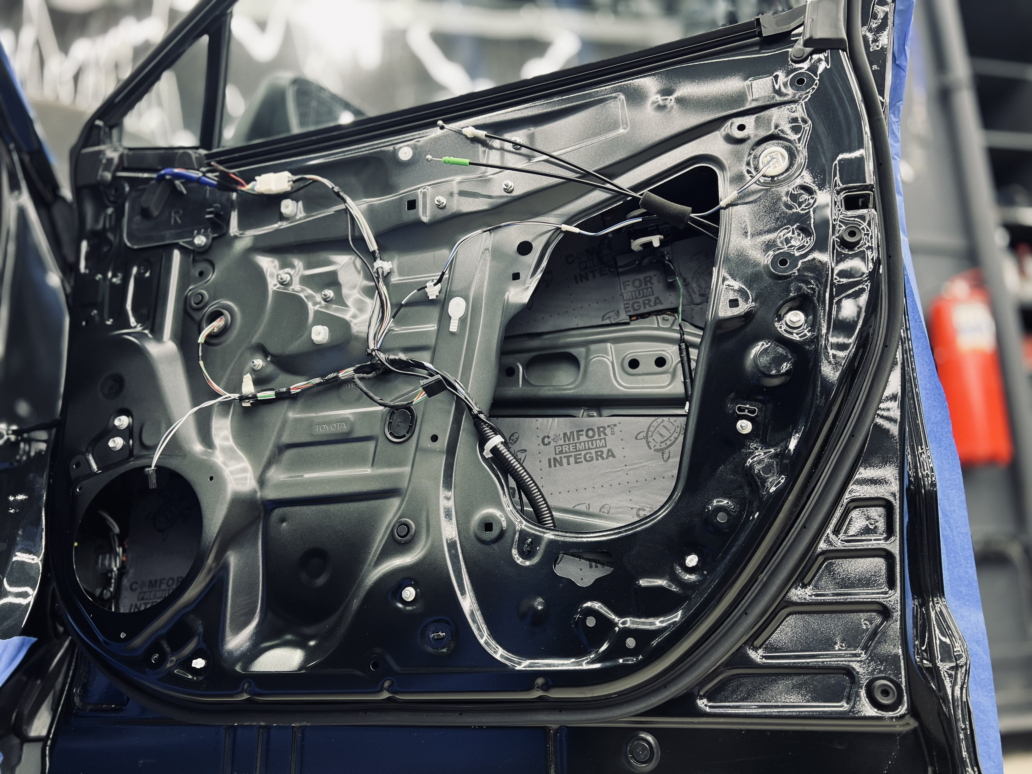 Первым слоем на двери и дверь багажника нанесли виброизоляцию Comfort Mat Dark Cobra, которую аккуратно подрезали для идеального прилегания.